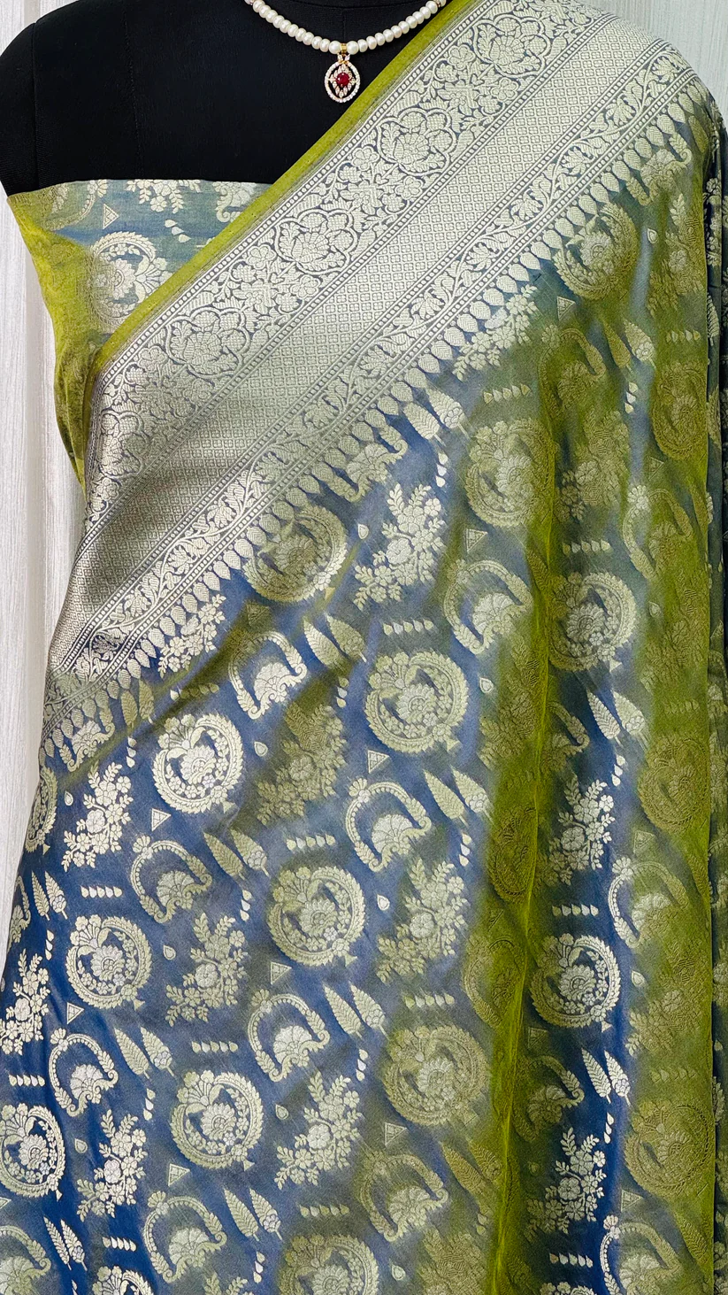 Draped in a rich Grey cross colored with green, this saree flows effortlessly and feels luxuriously soft on the skin — perfect for festive gatherings, rituals, or simply celebrating your everyday moments with grace.